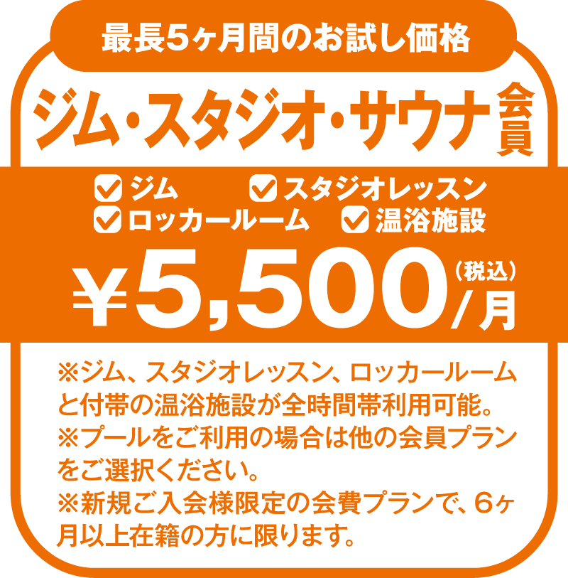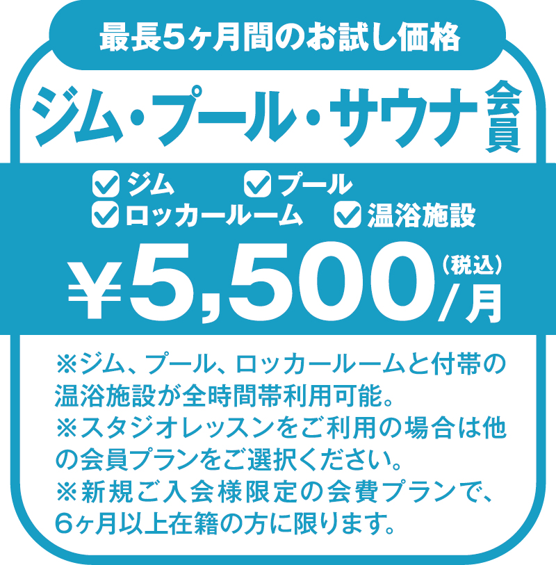 営業時間内全エリア・全プログラムをいつでも何時間でもご利用いただけます。ジムやスタジオ・プール、お風呂まで時間を気にせずゆっくりとご利用できます。体力アップやストレス解消など、ご自身に合った目標を見つけてみましょう。